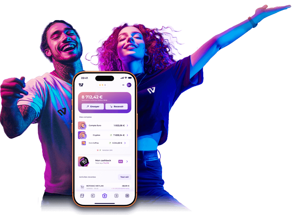 Reprends le contrôle de tes finances, grâce à une app mobile simple et intuitive. Avec un IBAN français, des cartes de paiement et jusqu’à 7% de cashback1 sur tes dépenses du quotidien !